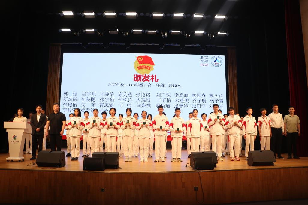 北京学校团委委员张雨老师宣读两校优秀团员名单,与会领导为优秀团员颁发证书并合影留念。