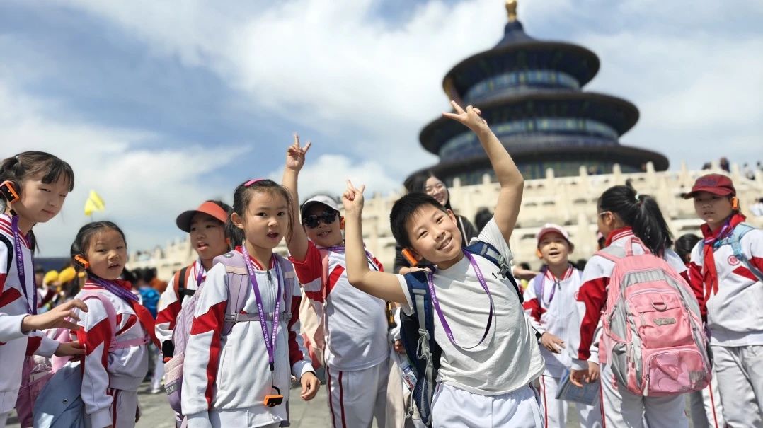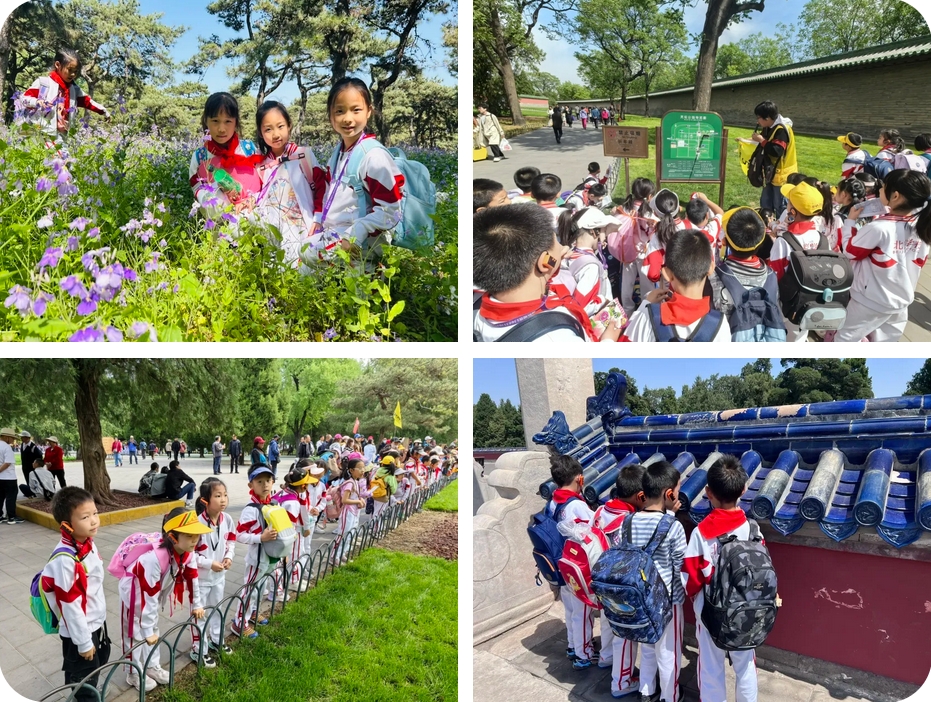 二年级学生走进天坛。首先开启“初识天坛——古代祭天场所”活动。同学们仰望着祈年殿那宏伟壮观的建筑,聆听着讲解员绘声绘色的讲述,感受到了古人对天地的敬畏与尊崇。随后,迎来了充满趣味与挑战的“寻找天坛建筑中的‘神奇’数字”活动。同学们分组行动,在祈年殿、圜丘坛等建筑中仔细观察、认真记录,不仅锻炼了观察力和团队协作能力,更对中国古代文化中的数字象征意义有了更深入的理解。活动尾声,同学们在老师的带领下,重温了《邓小平爷爷植树》这篇课文,还结合在天坛的所见所闻,分享了自己的感受和体会。