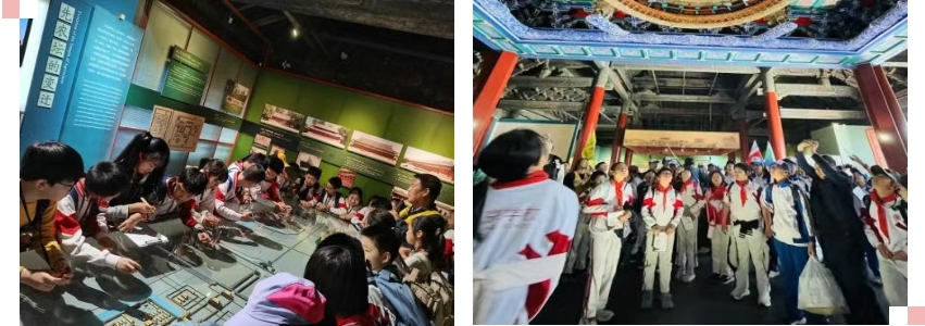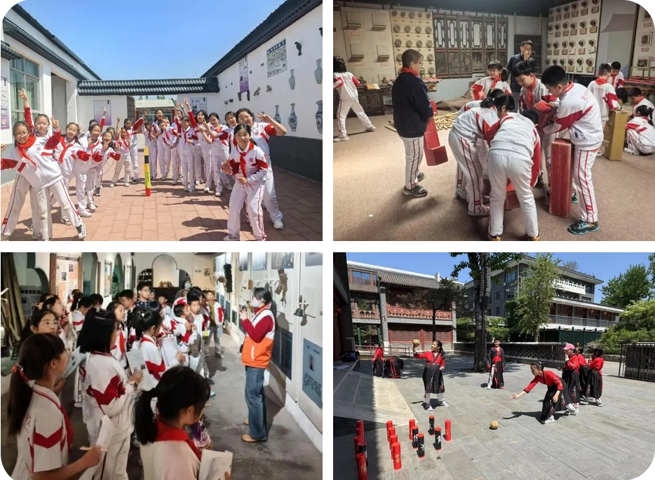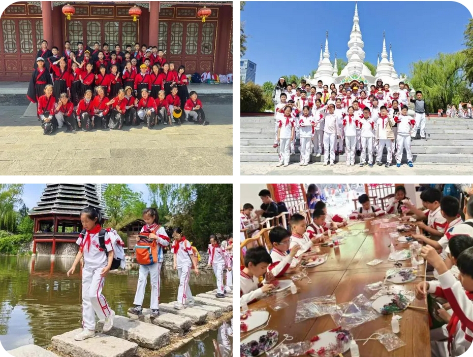 四年级8个班前往文旺阁木作博物馆,同学们在老师的指导下,制作木质小车和木质飞机,在团队挑战环节,他们既锻炼了手眼协调能力,更体会到团队合作的重要性。在参观环节,他们跟随讲解员走进木作的历史长河,从各行各业的工具到精美的生活用具,每一件展品都让人惊叹不已。这场木作研学之旅,不仅让他们触摸到传统工艺的温度,更在青砖灰瓦间重新认识了“匠心”的含义。四4班走进大观园居所,品读黛玉葬花、宝钗扑蝶、刘姥姥进大观园等著名情节,领略经典名著的魅力。同学们换上汉服,玩起了投壶,射箭等传统游戏,在游玩的同时了解和体验传统文化,最后还亲手描画了团扇。本次活动不仅帮助学生更好地理解书中的内容,还亲身体验到书中的场景,增加了学习的趣味性和深度,增强了文化自信。四8班走进中华民族园研学,从庄严的大昭寺到羌族的碉楼,从优雅的吊脚楼到傣族的曼飞龙塔,从侗族的风雨桥到藏族的康巴民居,文化讲解员带领同学们进入了一个个“民族魔法城堡”。通过了解绚烂多彩的民族文化,启发他们在未来更深入的探索华夏民族“和而不同”的魅力,提升民族自信心和自豪感。