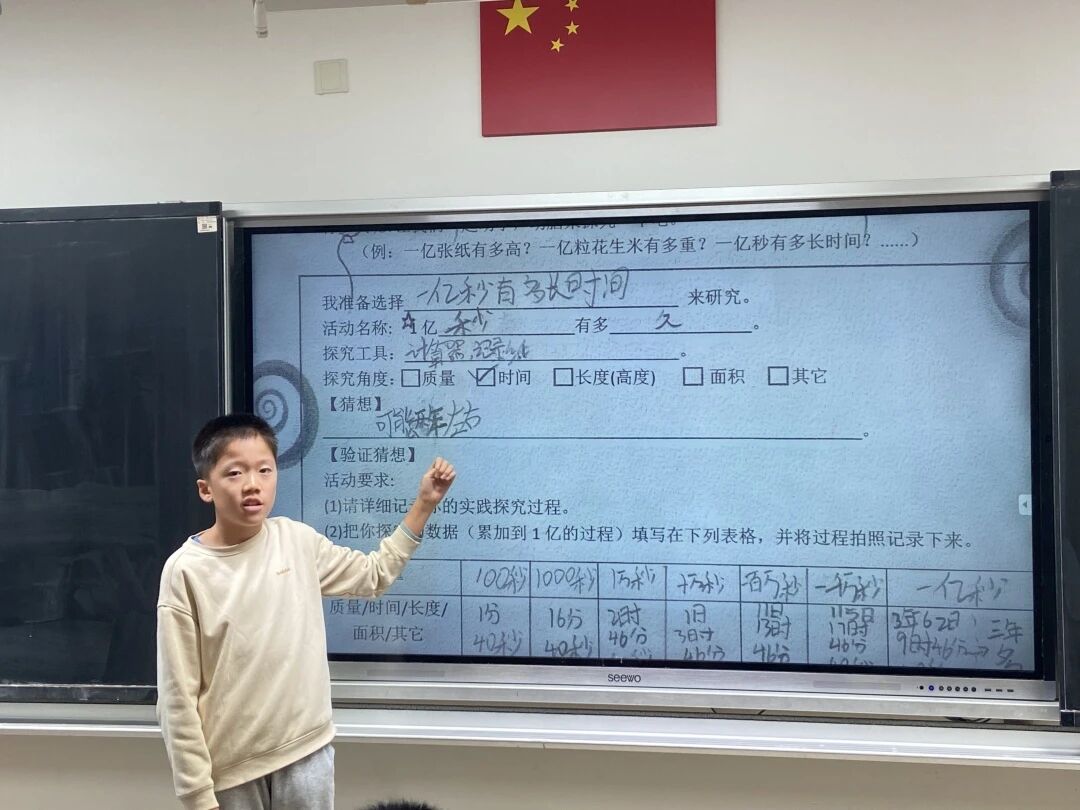 四年级开展“寻’亿’大侦探”活动,学生在日常生活中寻找“一亿”的“样子”,学生们在好奇心的驱使下走进长度、质量、时间等,感受着惊人的数量冲击!