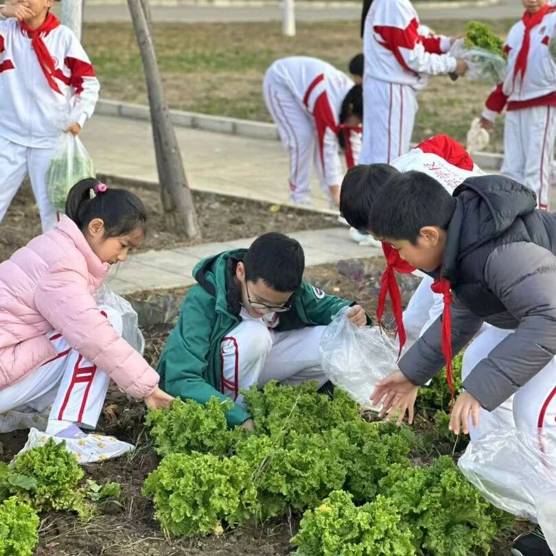 利用周五课后服务的时间,各中队再次集结。队员们化身“小小收割师”,在辅导员的带领下,兴奋地涌入菜地。他们用手握住蔬菜根部,轻轻一拔,带着泥土芬芳的蔬菜被完整采收。队员们互相展示着劳动成果,比一比谁采的菜更大、更水灵,欢笑声、惊叹声此起彼伏,汇成了一曲动人的“丰收乐章”。