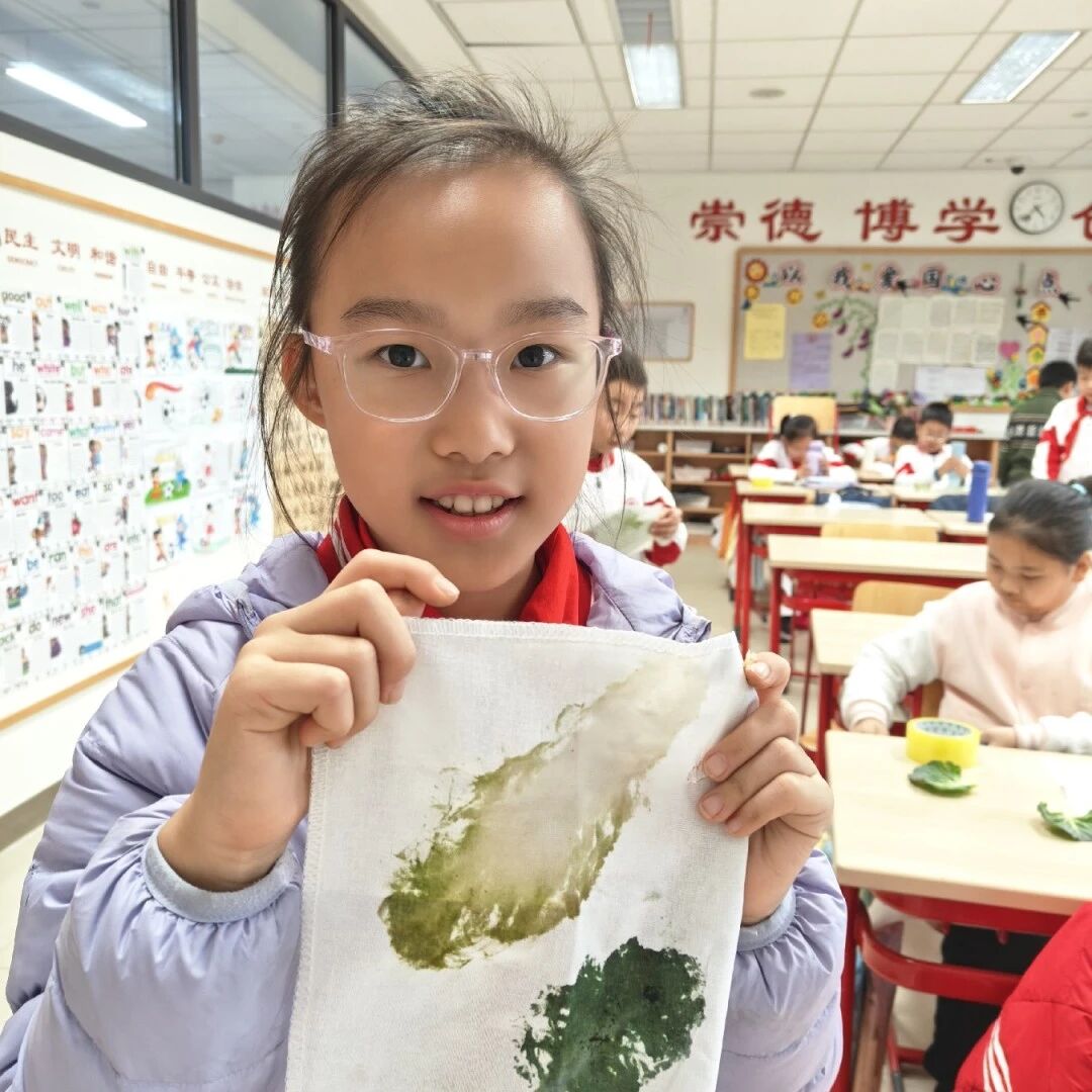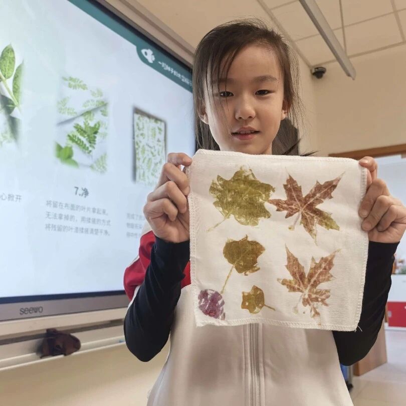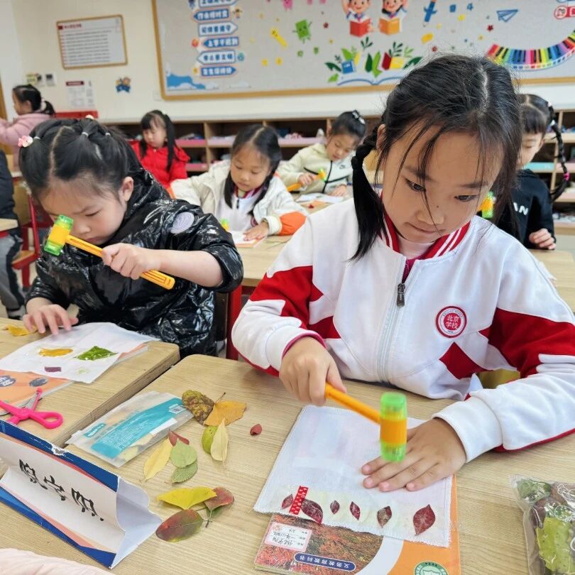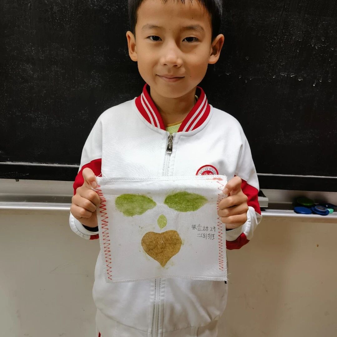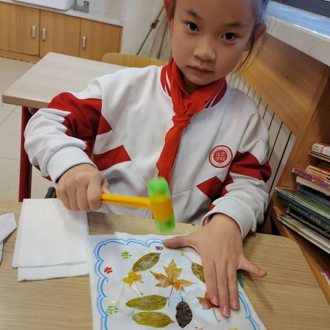 “咚咚咚……”富有节奏的敲击声在教室里回荡。在一次次敲打下,叶片和蔬菜中的天然色素慢慢渗透到布料上,留下了自然的脉络、形状和绚烂的色彩——生菜的翠绿、白菜的深绿、落叶的金黄与赭红……每一幅作品都是大自然与童真巧思的完美结合,形成了巧妙的艺术效果。