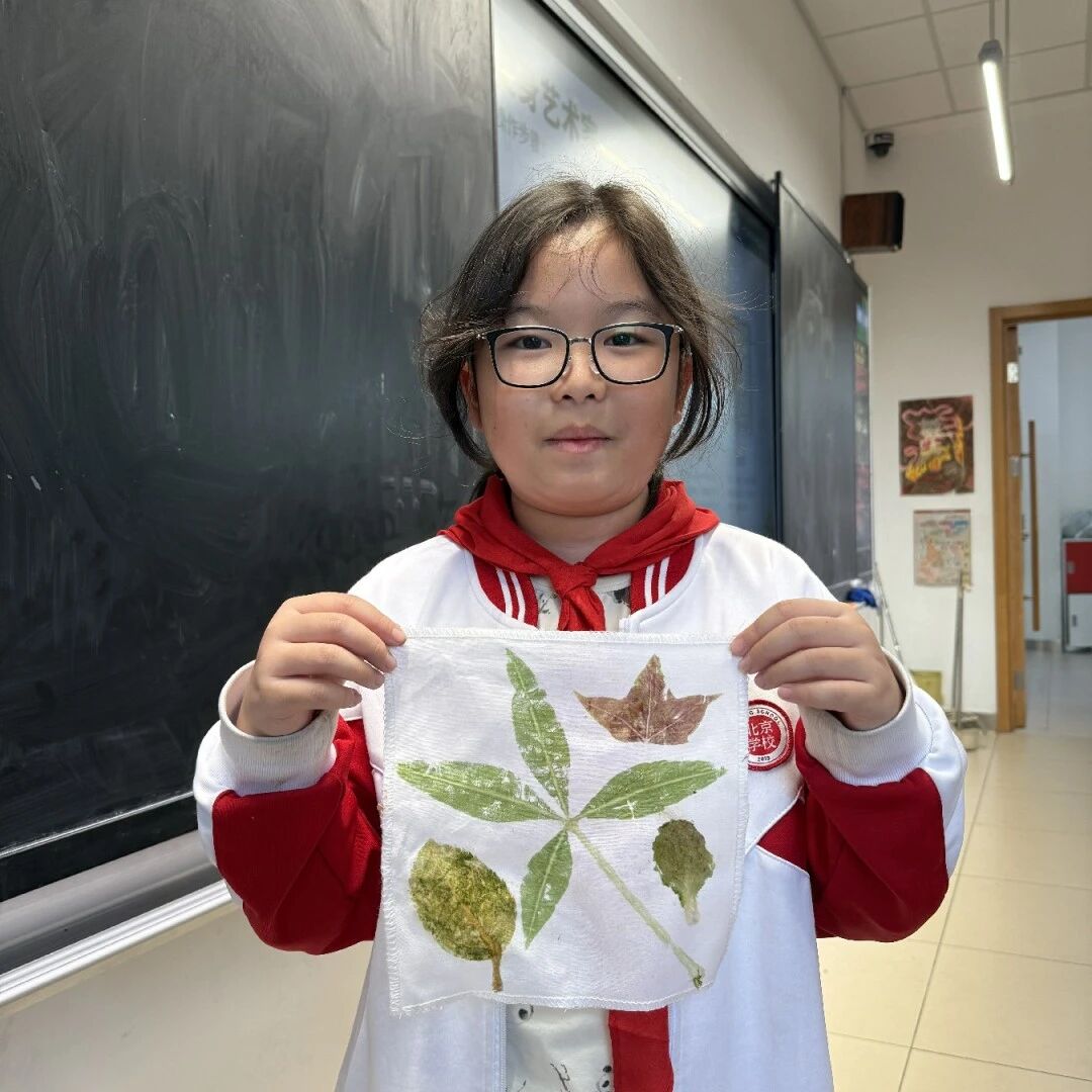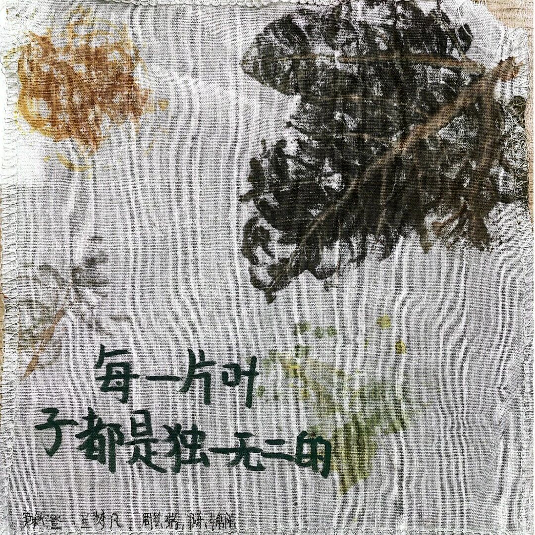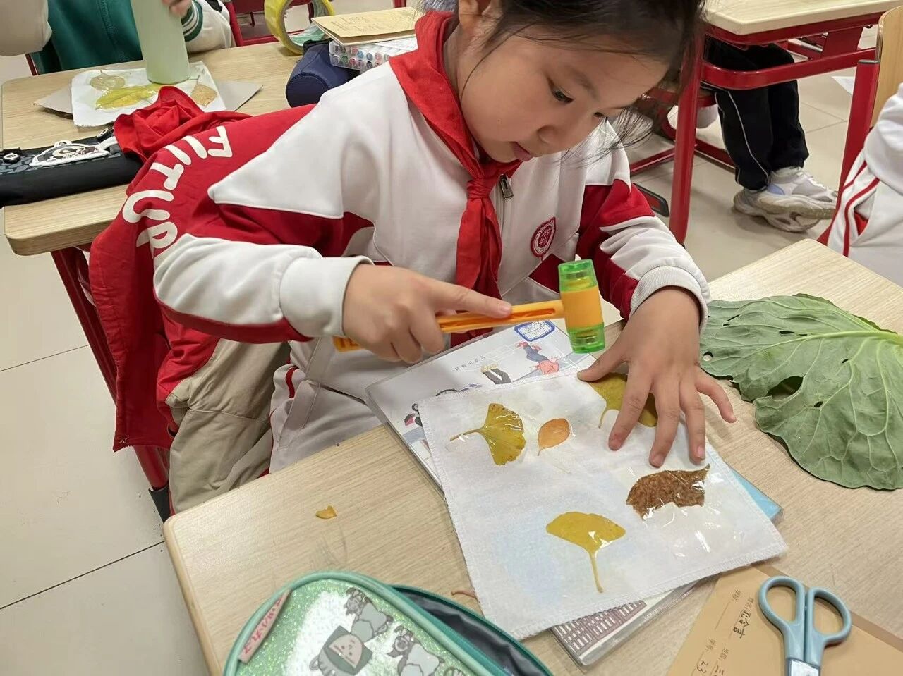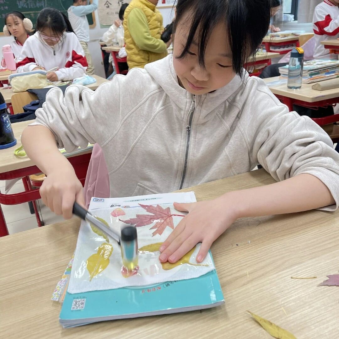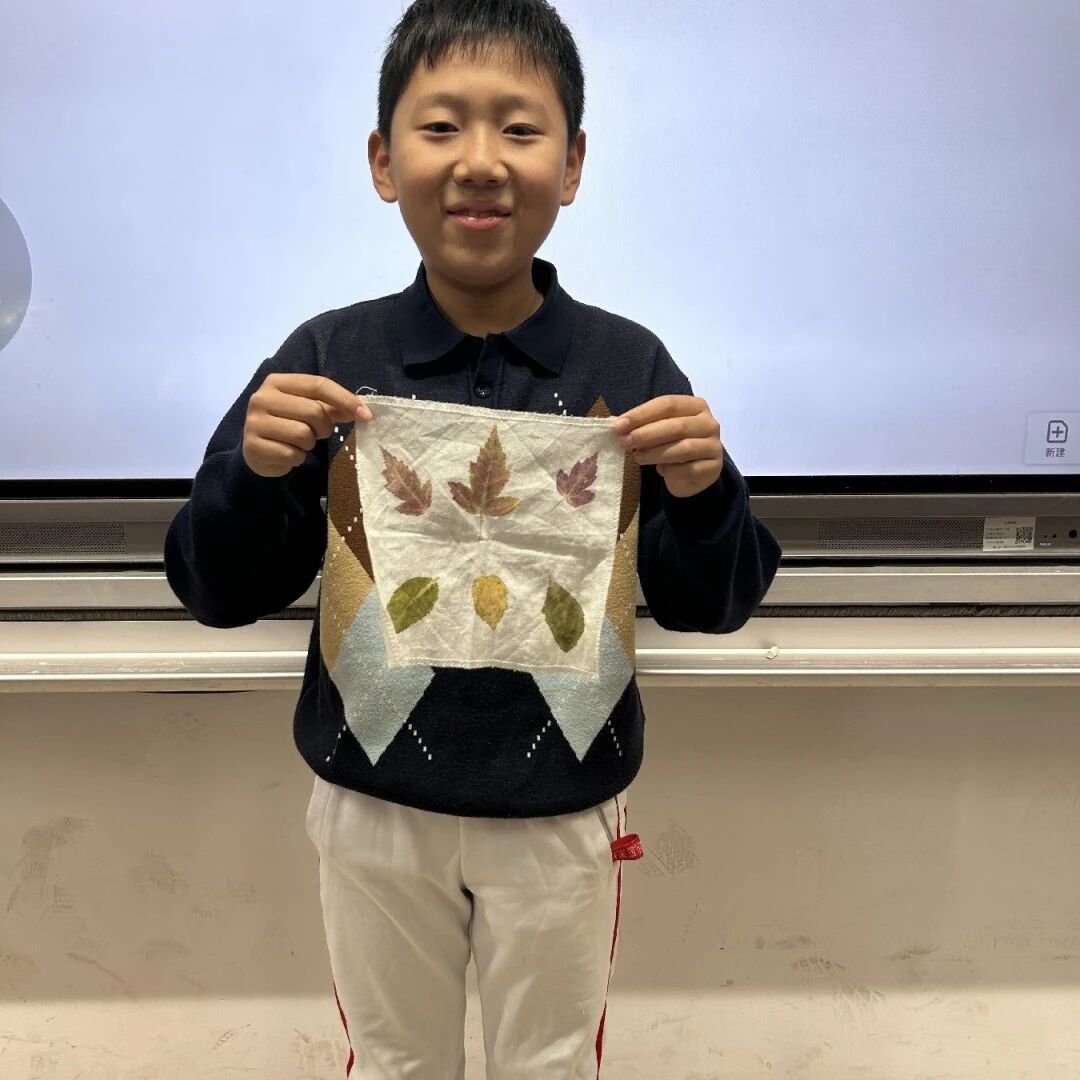“咚咚咚……”富有节奏的敲击声在教室里回荡。在一次次敲打下,叶片和蔬菜中的天然色素慢慢渗透到布料上,留下了自然的脉络、形状和绚烂的色彩——生菜的翠绿、白菜的深绿、落叶的金黄与赭红……每一幅作品都是大自然与童真巧思的完美结合,形成了巧妙的艺术效果。