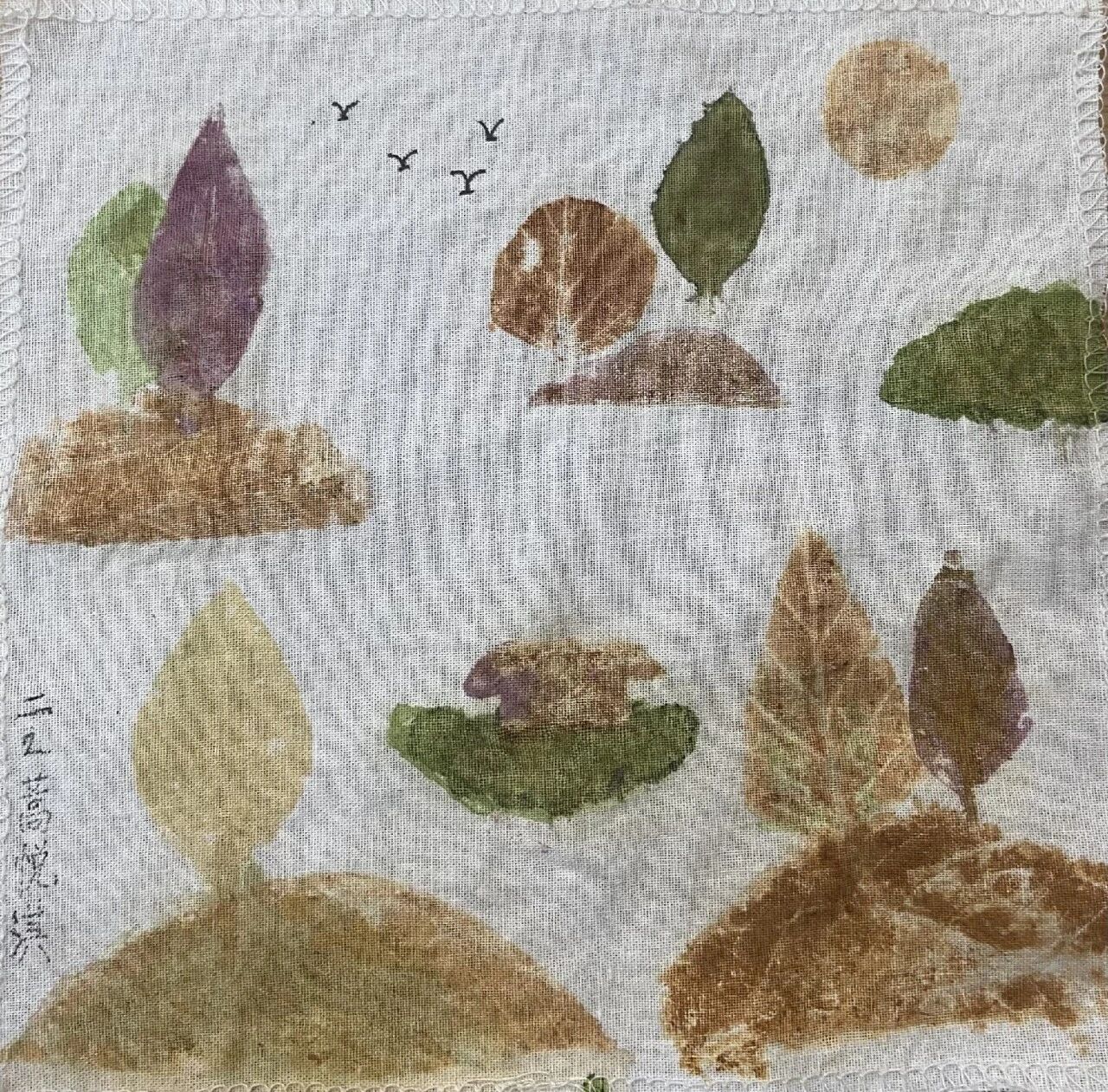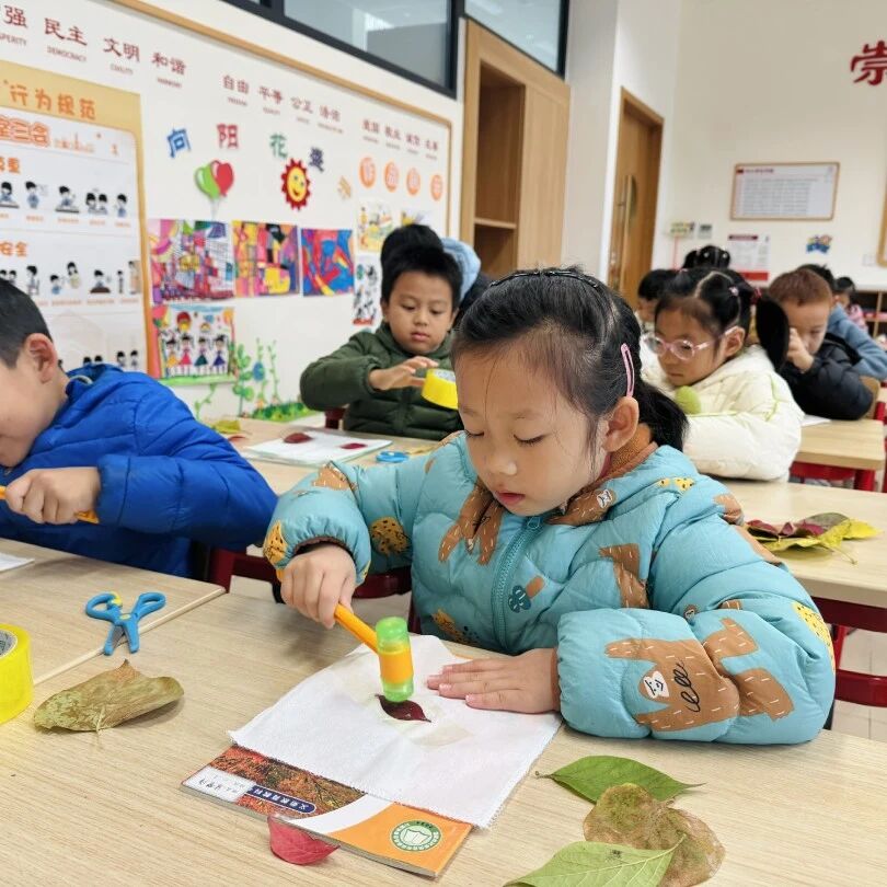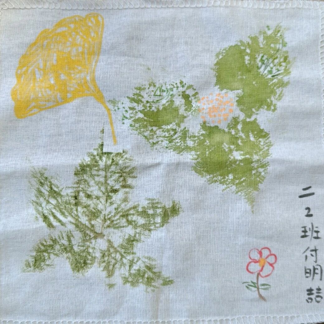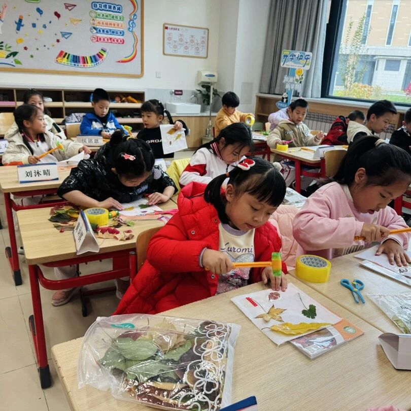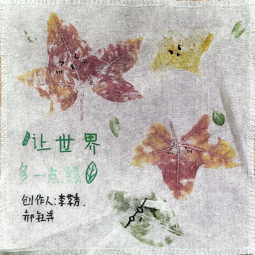 “咚咚咚……”富有节奏的敲击声在教室里回荡。在一次次敲打下,叶片和蔬菜中的天然色素慢慢渗透到布料上,留下了自然的脉络、形状和绚烂的色彩——生菜的翠绿、白菜的深绿、落叶的金黄与赭红……每一幅作品都是大自然与童真巧思的完美结合,形成了巧妙的艺术效果。