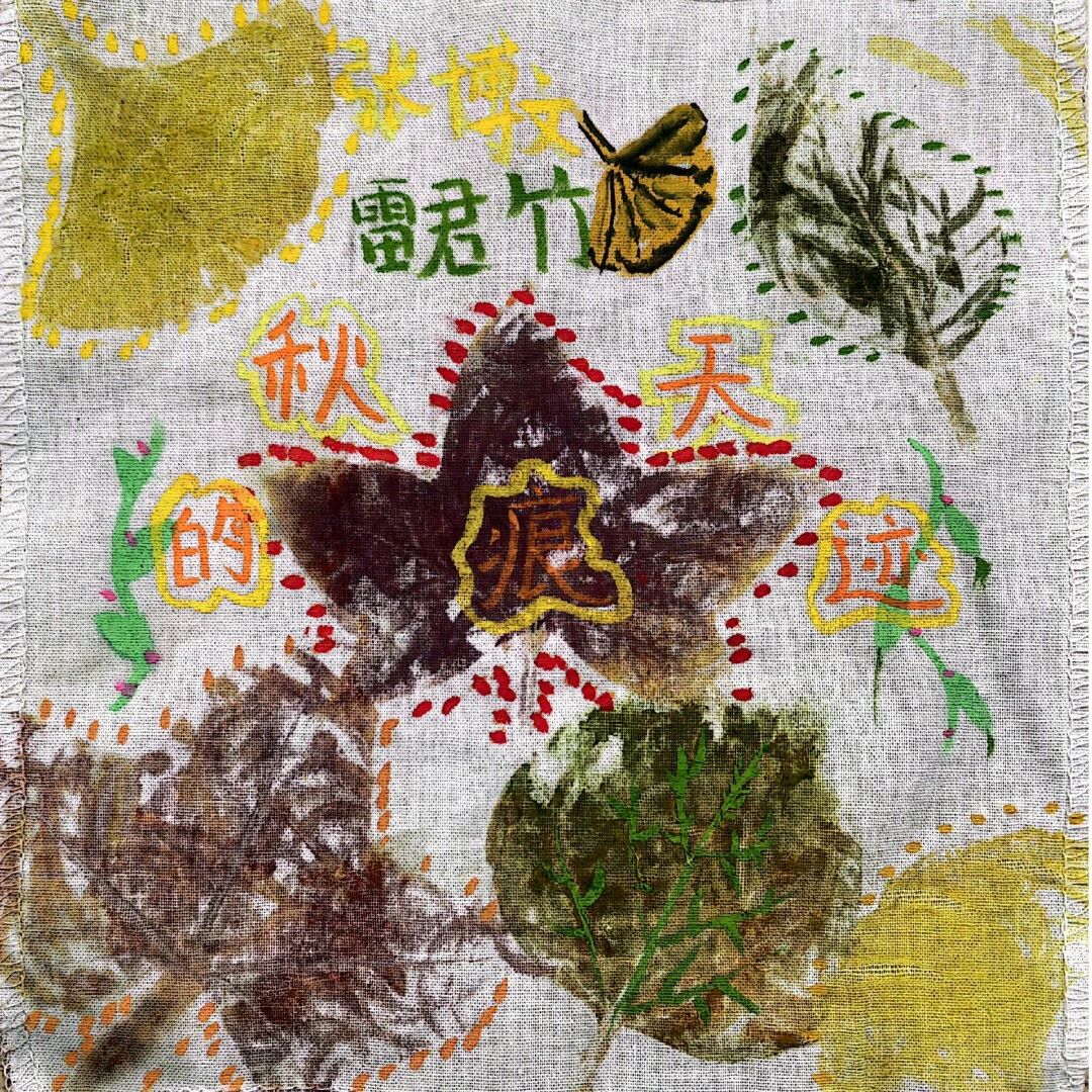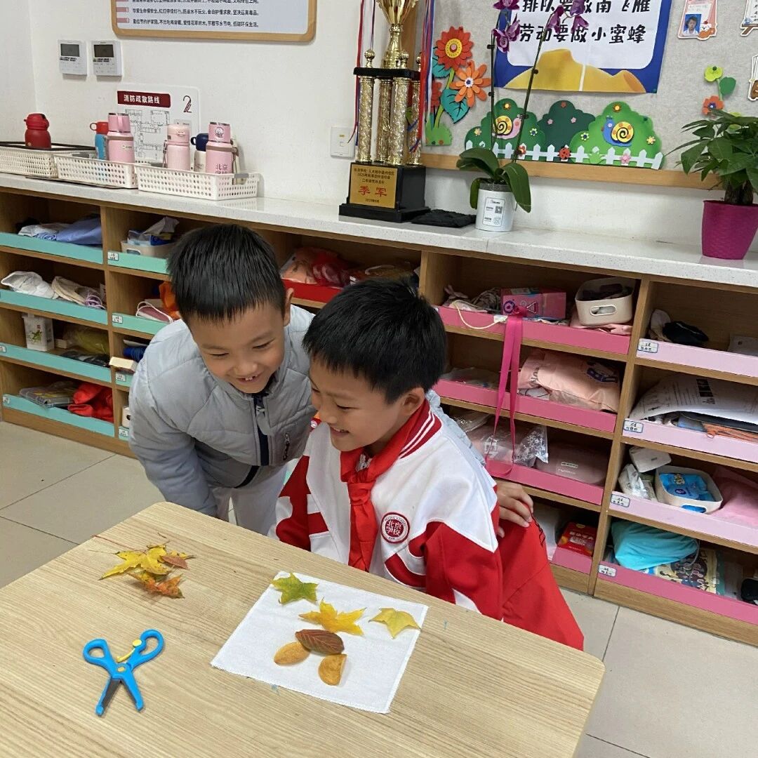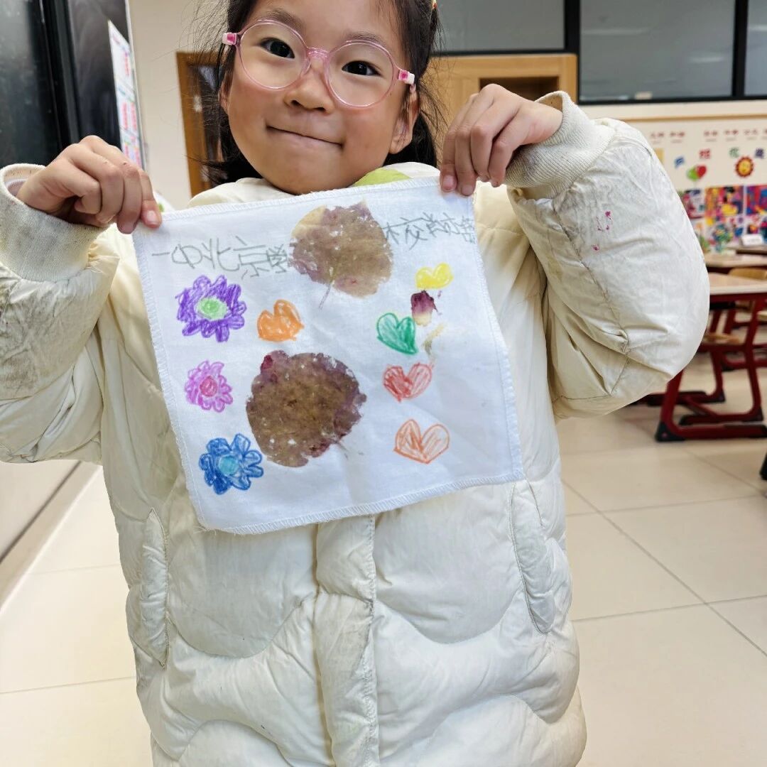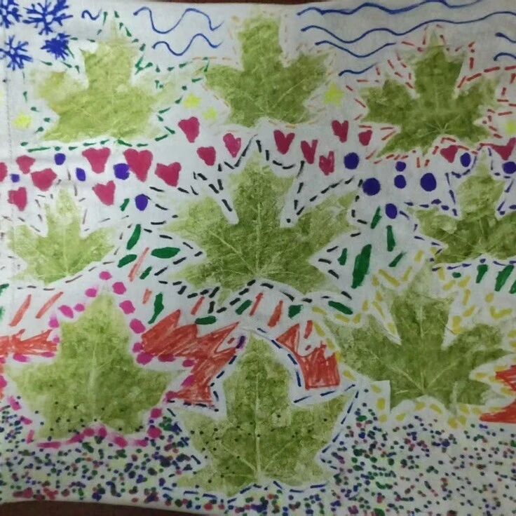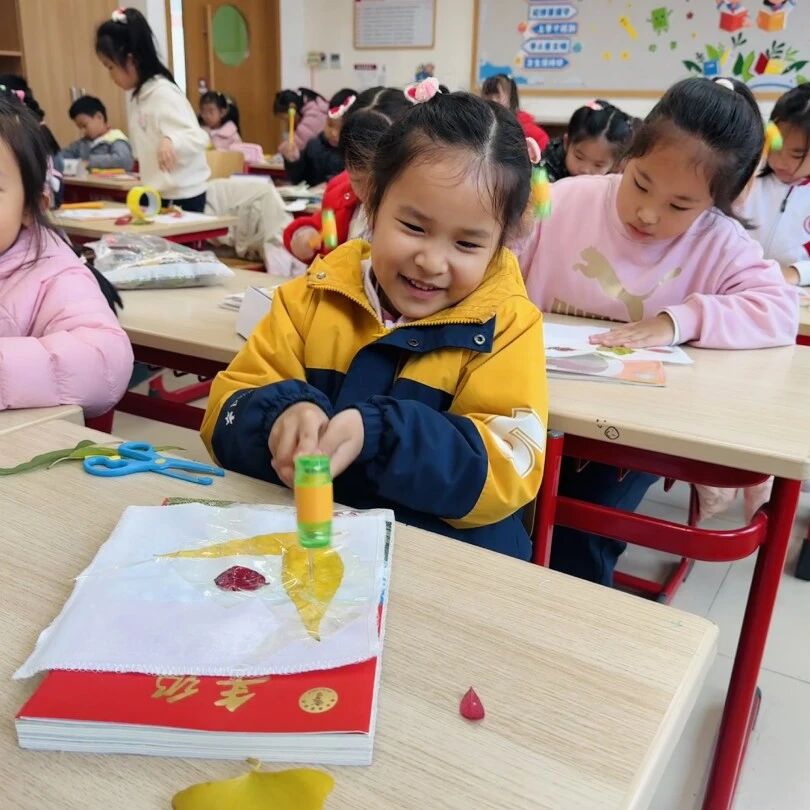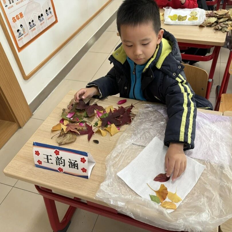 “咚咚咚……”富有节奏的敲击声在教室里回荡。在一次次敲打下,叶片和蔬菜中的天然色素慢慢渗透到布料上,留下了自然的脉络、形状和绚烂的色彩——生菜的翠绿、白菜的深绿、落叶的金黄与赭红……每一幅作品都是大自然与童真巧思的完美结合,形成了巧妙的艺术效果。