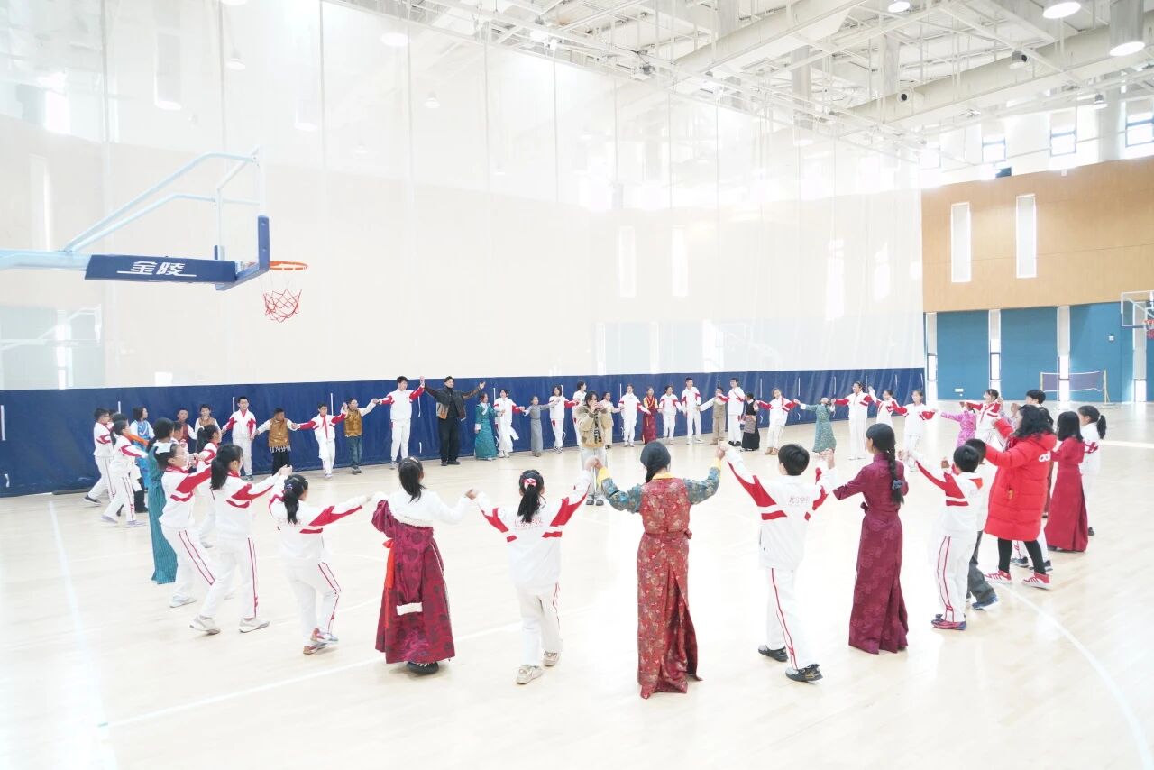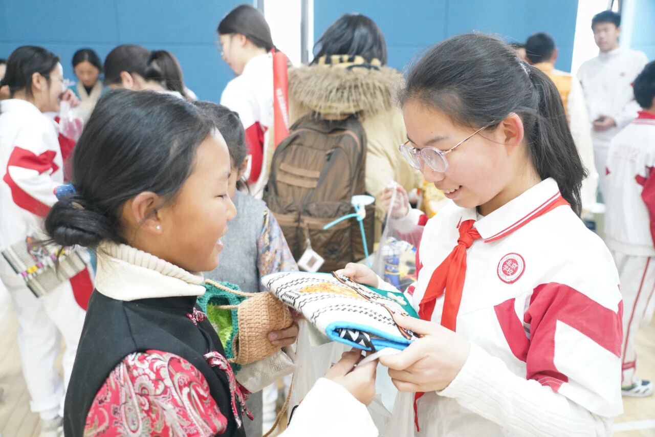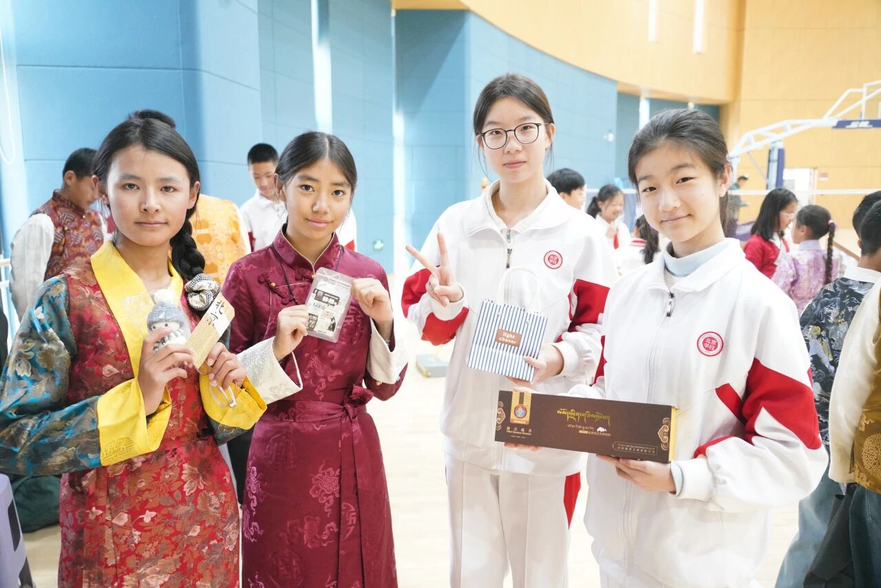 升旗仪式后,拉萨学生与小学五年级、初二年级的学生代表到共享区体育馆集合,互赠精心准备的小礼物。大家在老师的带领下玩腰旗橄榄球,组队踢球,学跳藏族舞蹈,共唱藏族歌曲,欢声笑语中缩短彼此间的距离。在“拿起纸笔、见字如面”互动环节,同学们写下心里话,互留联系方式,让这份跨越山海的稚嫩友谊在今后延续。