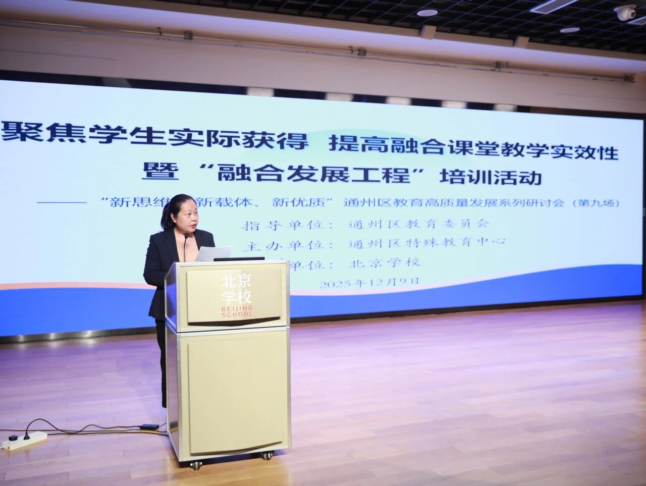 为贯彻落实“十四五特殊教育提升行动计划”和“融合发展工程”要求,推动通州区融合教育高质量发展,2025年12月9日,“聚焦学生实际获得 提高融合课堂教学实效性”暨“融合发展工程”培训活动——“新思维、新载体、新优质”通州区教育高质量发展系列研讨会(第九场)在北京学校举行。