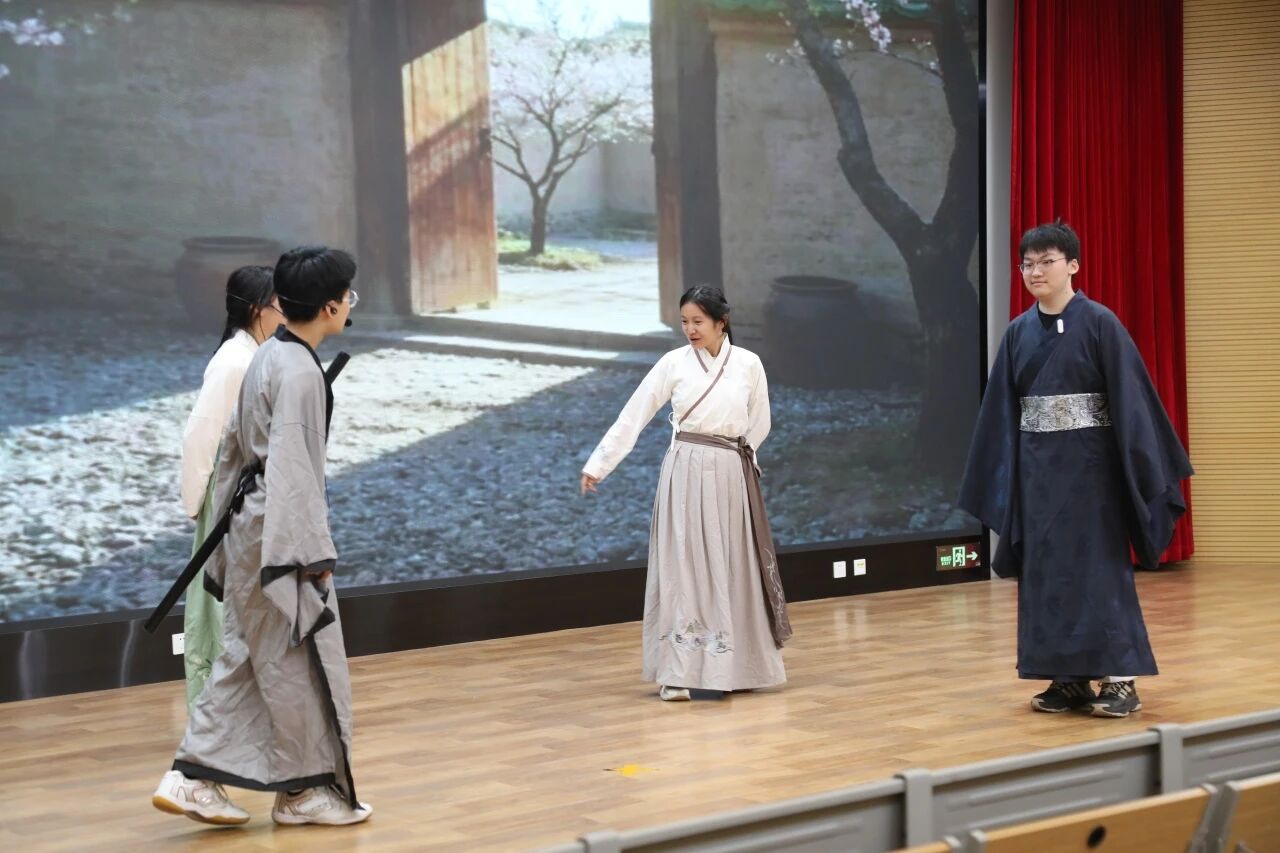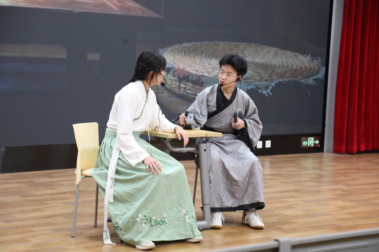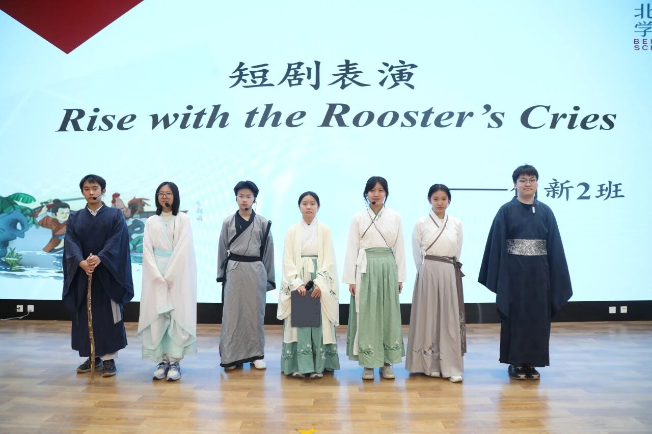 创新2班的英文短剧《闻鸡起舞》,以经典故事为蓝本,用全英文演绎的方式,将祖逖与刘琨以晨鸡为号、坚持练剑的故事生动呈现。同学们分工协作、默契配合,在精彩的表演中,诠释了“坚持”的意义,更展现了书院学子的英语素养与团队精神,让大家深刻体会到:并肩作战的成长,远比独自前行更动人。