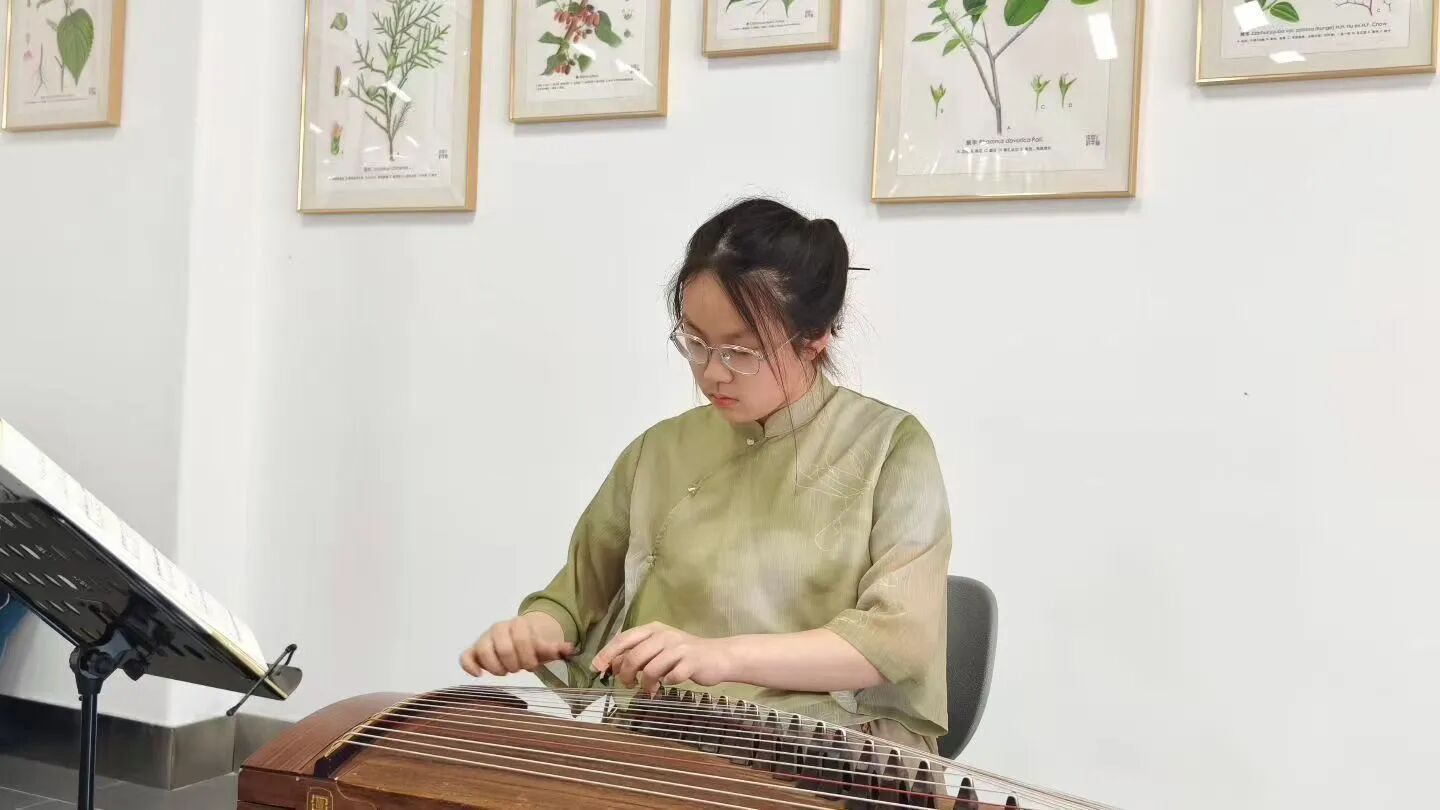 在志愿者的引导下,师生与来宾抵达图书馆一层“本草科学馆”。馆内雅韵流转,一幅幅精美的中医本草挂画悬于壁间,身着素色汉服的学子端坐琴前,轻拨琴弦,空灵悠远的古筝声袅袅升起,将人带入“琴韵伴本草,书香润心田”的诗意境界。
