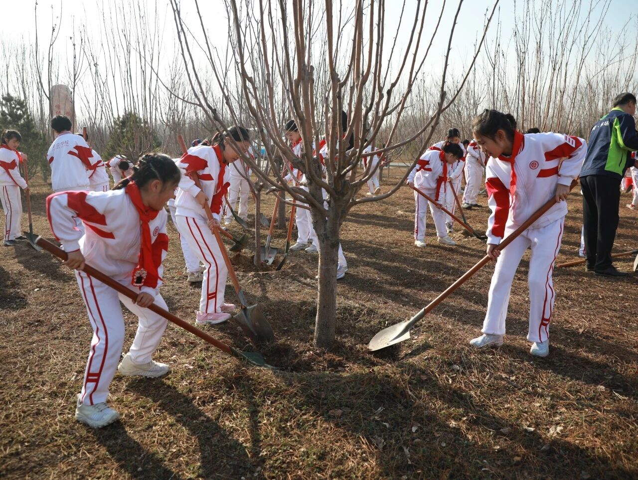 时隔两年,队员们再次来到这片林地,河畔清风依旧,当年栽种的树苗已抽出新枝、茁壮成长。在辅导员老师的引导下,队员们分工协作、干劲十足。大家挥锹铲土、围堰浇水,共同爱绿、护绿、植绿,忙碌的身影与新绿的树苗构成了一道亮丽的风景线。